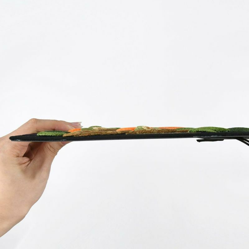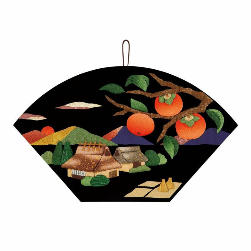 土台は末広がりで縁起のよい「扇」型。黒地なので色鮮やかな押絵パーツがより映え、際立ちます。
