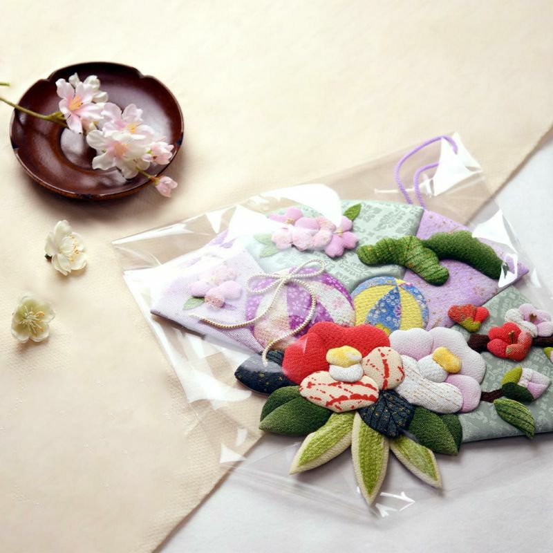 椿・桜・松竹梅と吉祥花にまりを添え、末広がりの扇形でまとめました。1つ1つのモチーフに願いが込められているので、家族や大切な方への贈り物にもおすすめです。お正月や新年を彩る壁飾りとしてぜひお作りください。