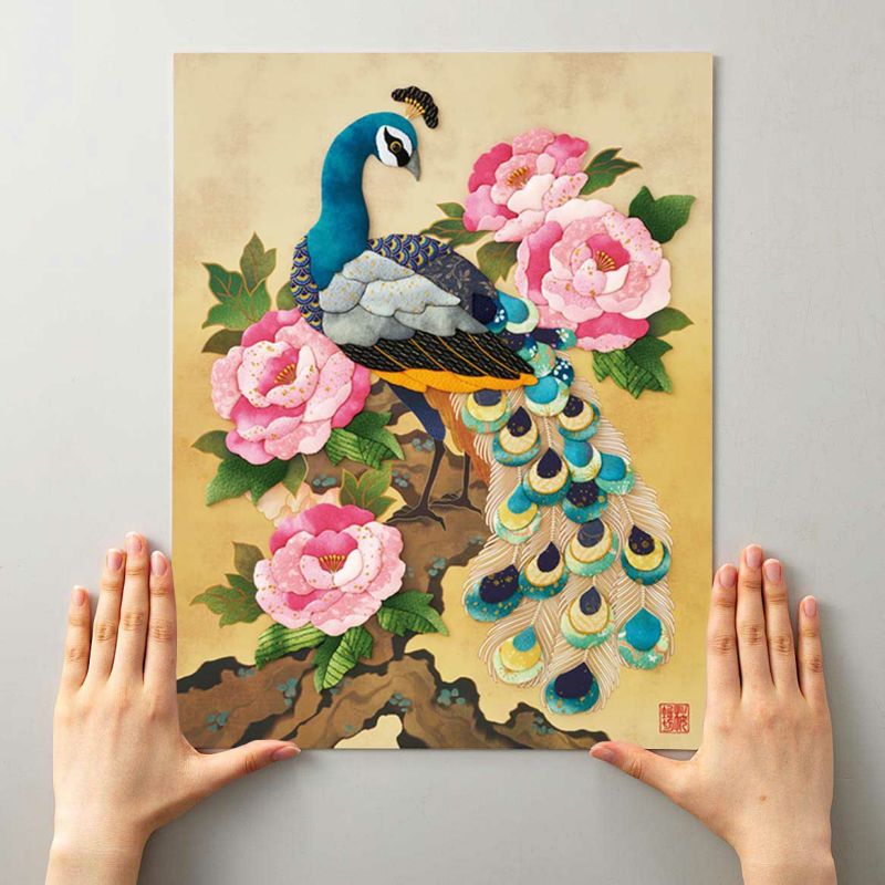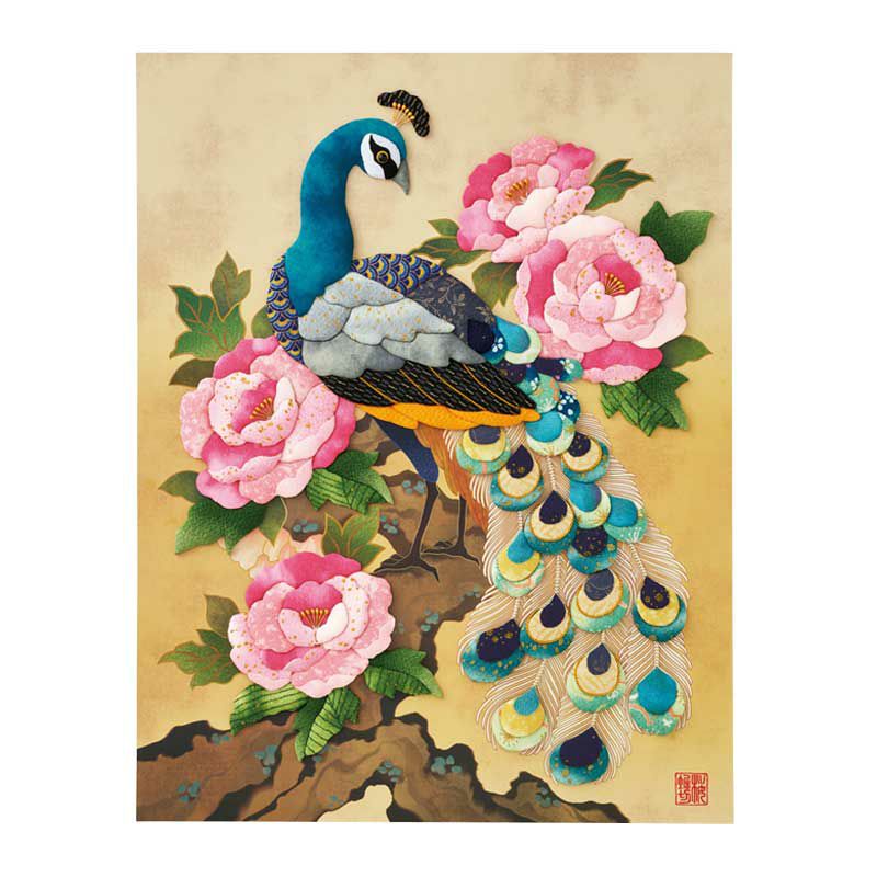 孔雀の気品と牡丹の華やかさを繊細な曲線で表現。色褪せない美しさで空間に優雅な彩りを添えます。別売りのF6用額に収めれば、作品の魅力がより一層際立ちます。