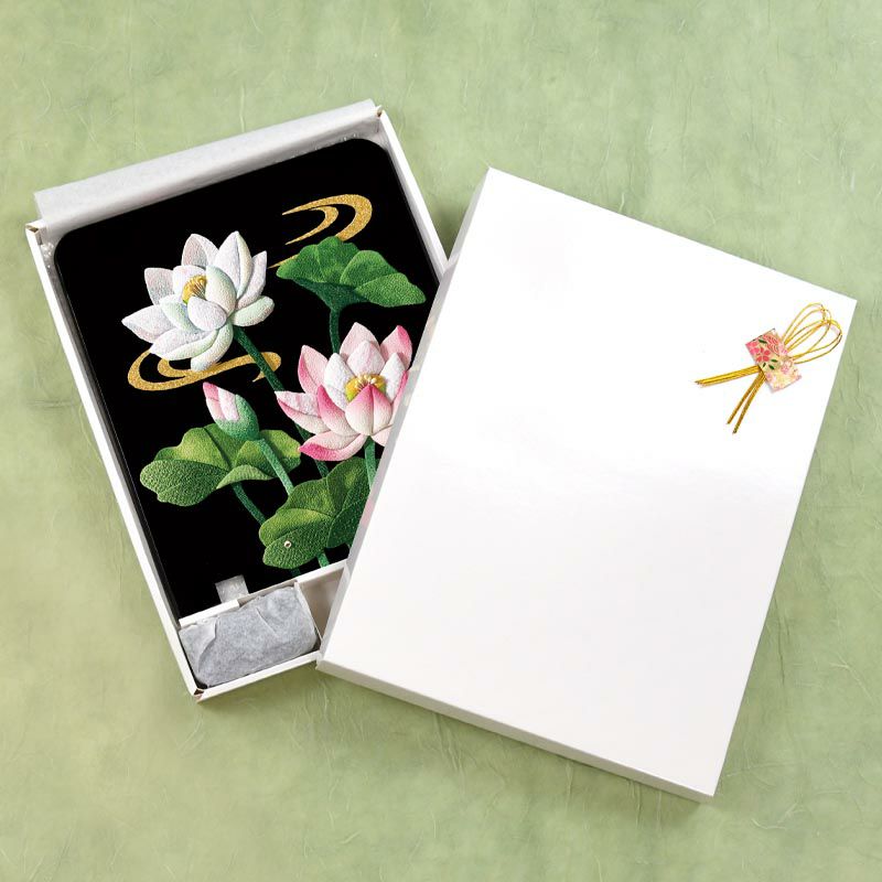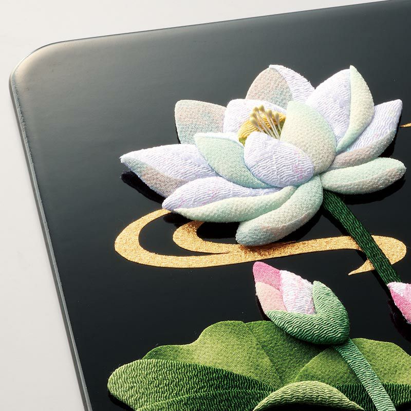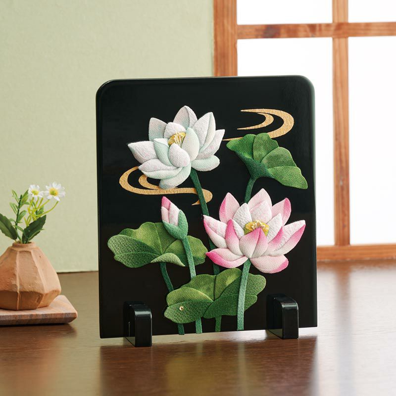 高級感のある黒地の衝立に上品で美しい蓮の花が映えます。玄関やお部屋に飾るとその空間を爽やかに彩ってくれます。