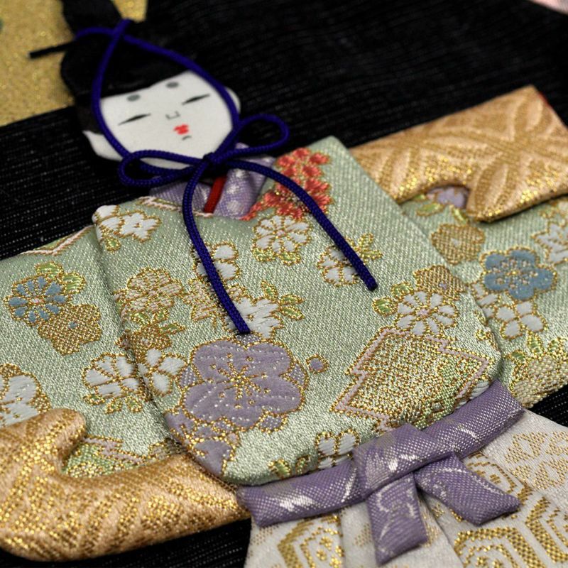 高級織物の名産地、京都・西陣の伝統的な「西陣織金襴」生地を使用しています。美しい柄や色彩の本格的なお雛さま飾りをお作りいただけます。