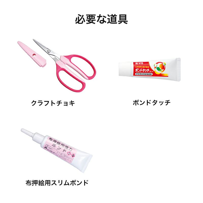 はさみ、セロテープ、ボンドタッチ、目打ち、布押絵用強力ボンド(金襴布に)、ものさし