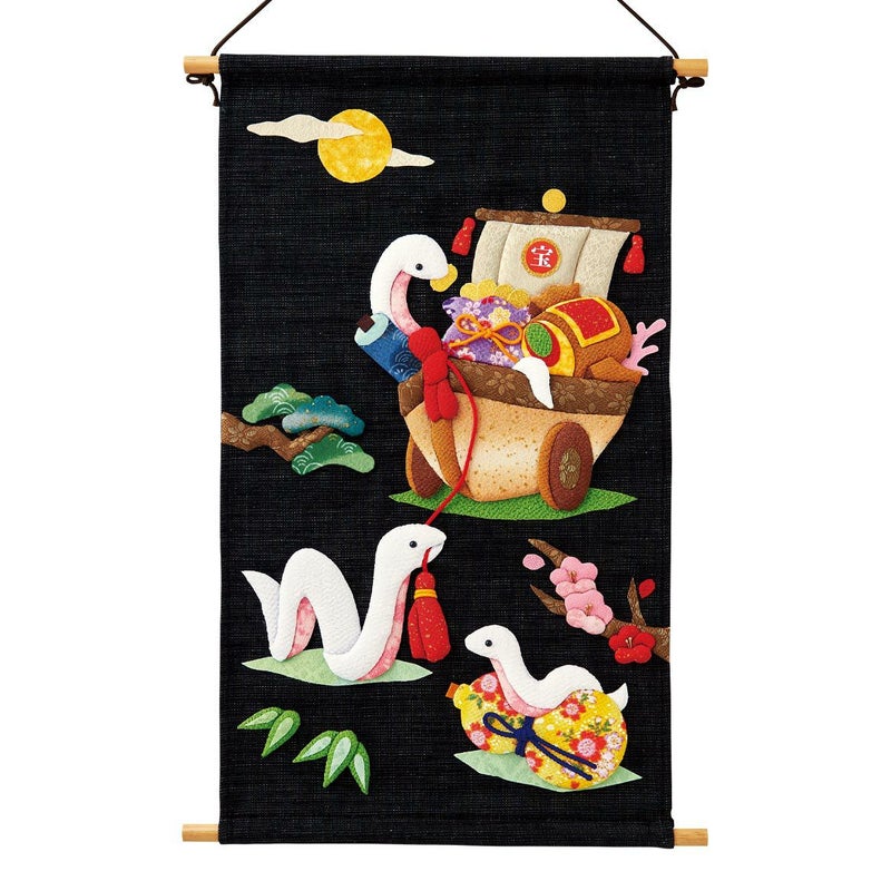 へびが福を宝船にたくさん乗せて運んできてくれるような、作りごたえも見ごたえもある絵柄です。