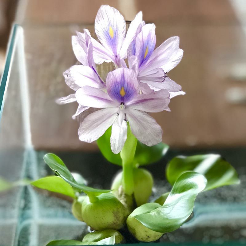 • ホテイアオイは金魚と一緒に入れることができ、水槽を彩る水草として人気があります。浮袋のようにふくらんだ葉柄が七福神の布袋様のお腹に見立てられたことからこの名が付いたと言われているそうです。
