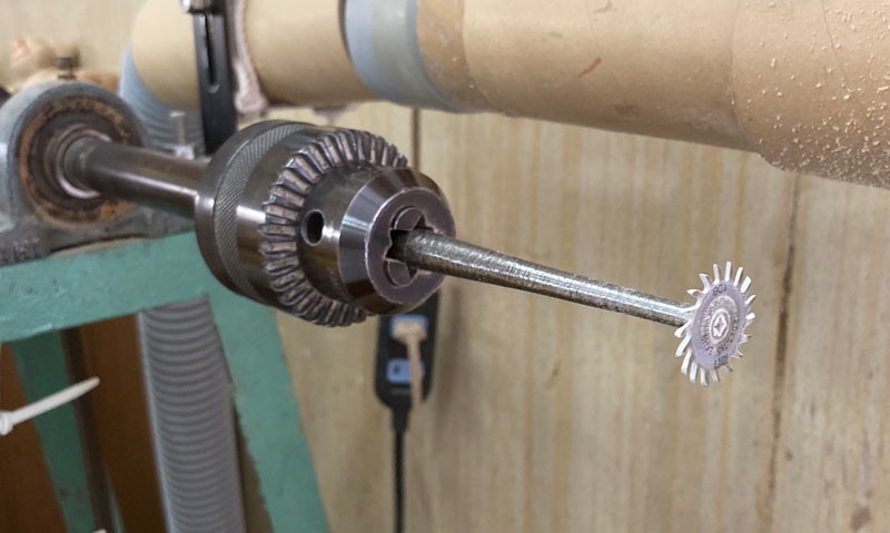 長い軸の先端には丸いのこぎりのような歯がついています。