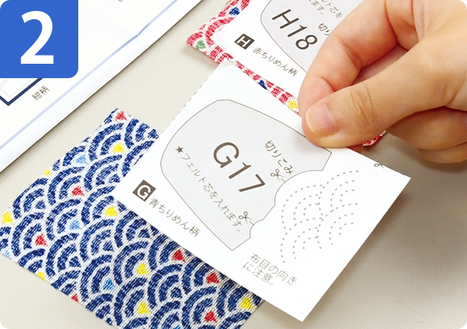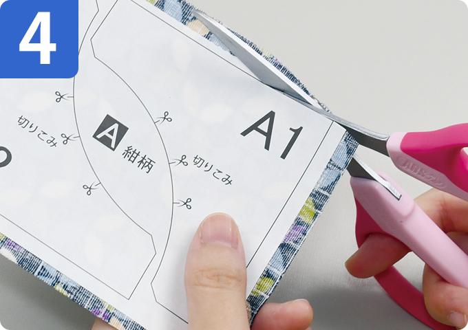 布用型紙を点線で切り、説明書の「布の使い方」を参考に布の裏に貼ります。