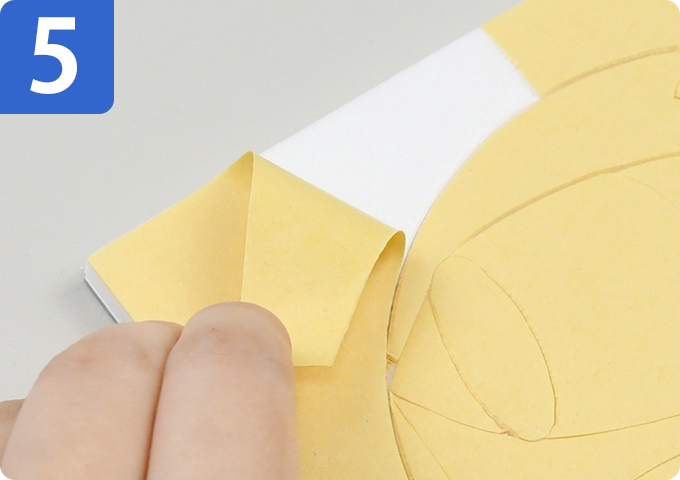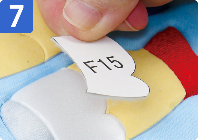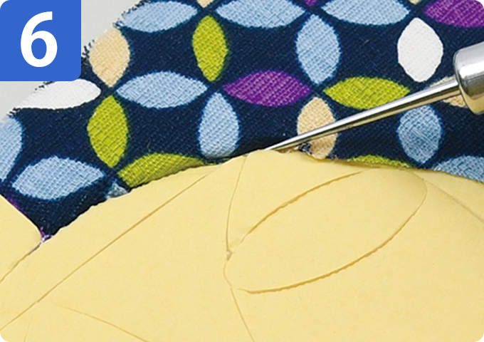 フェルト芯のはく離紙をはがし、5~6と同様に布を貼り、布の端をミゾにきめこみます。