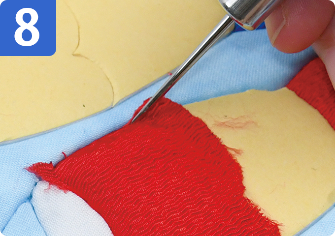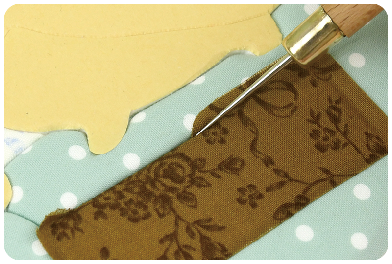 専用目打ちで布をなぞり、布の端をすべてミゾの中へ入れます。