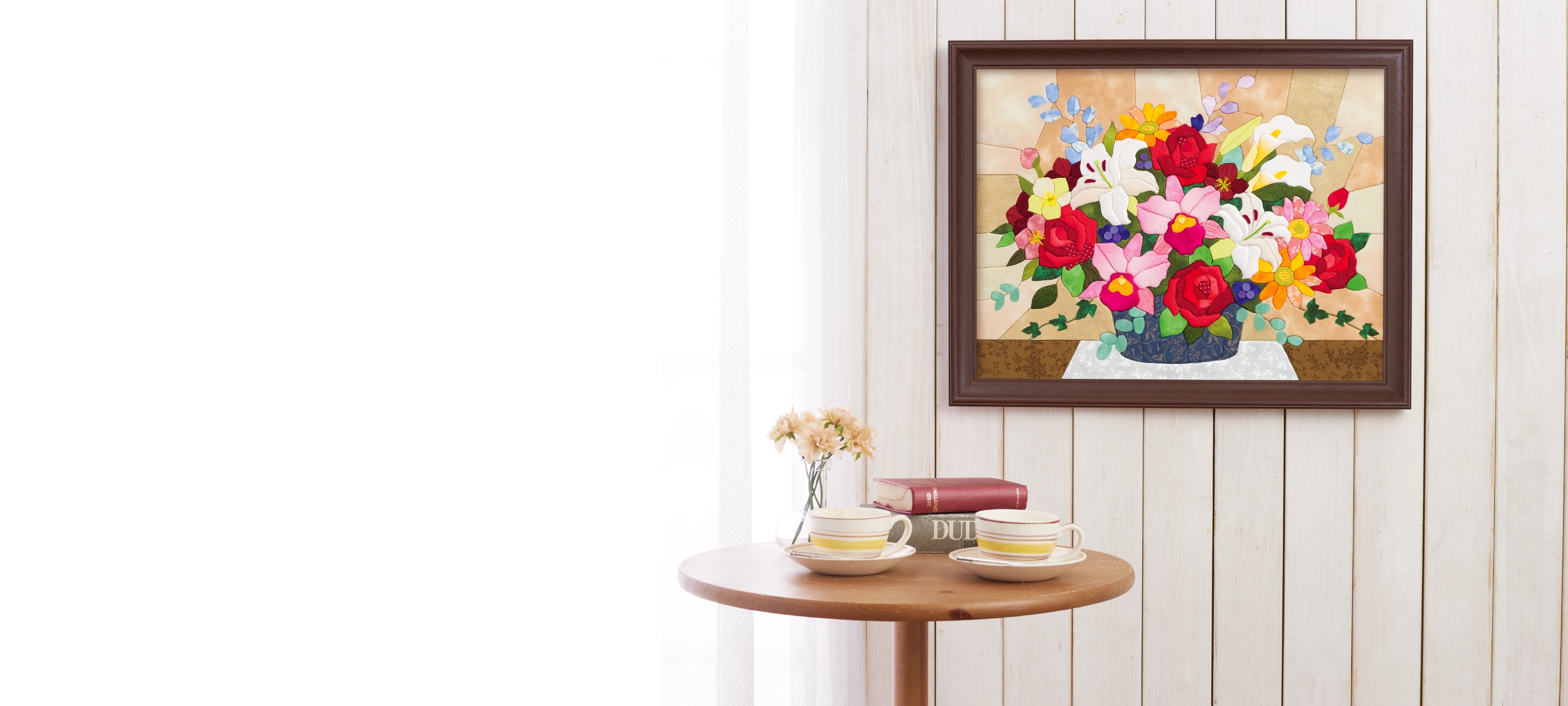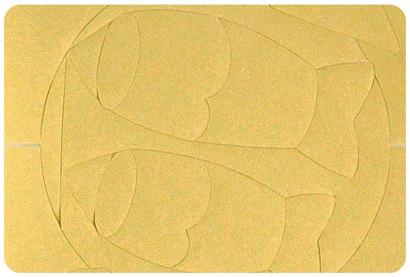 ミゾに入れる手法に加え、一部フェルト芯などを使用して遠近感や立体感を表現した凹凸のある絵柄が完成します。 -
