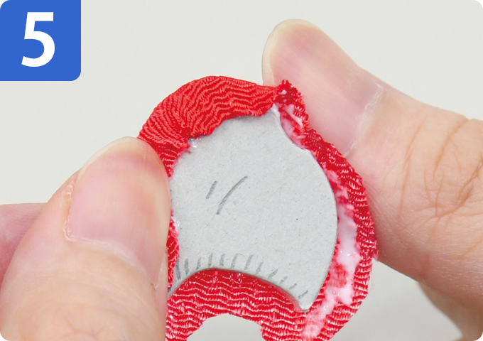 布の部分にボンドタッチを薄く塗り、斜線部分を残して、パーツを布でくるみます。