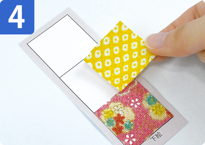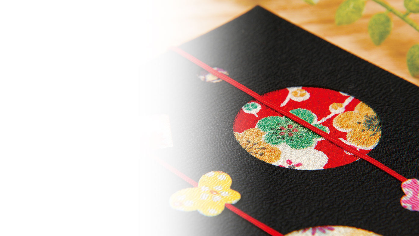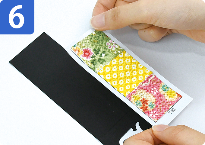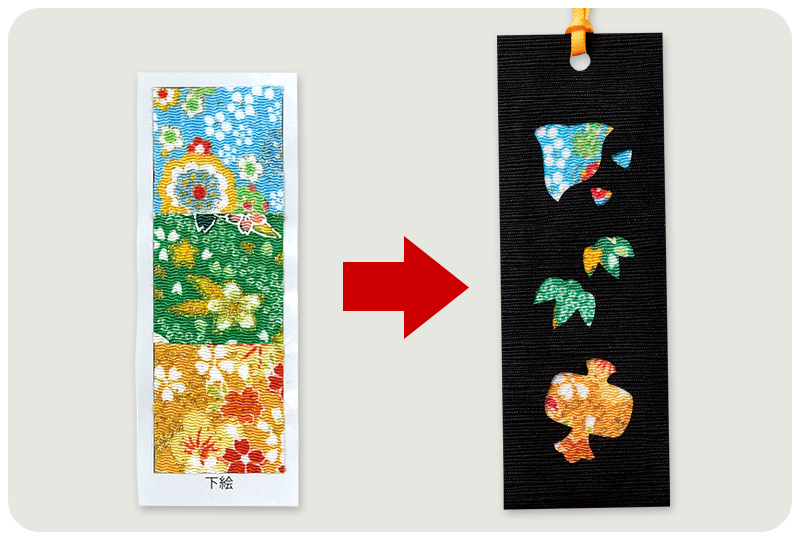 黒色の型抜きボードを重ねれば、色鮮やかなちりめん布の絵柄が浮かび上がり、高級感のある和風モダンアートが完成します。