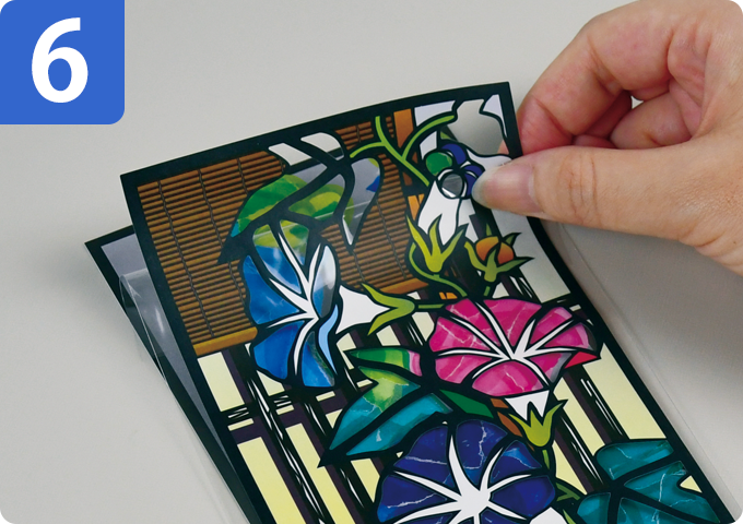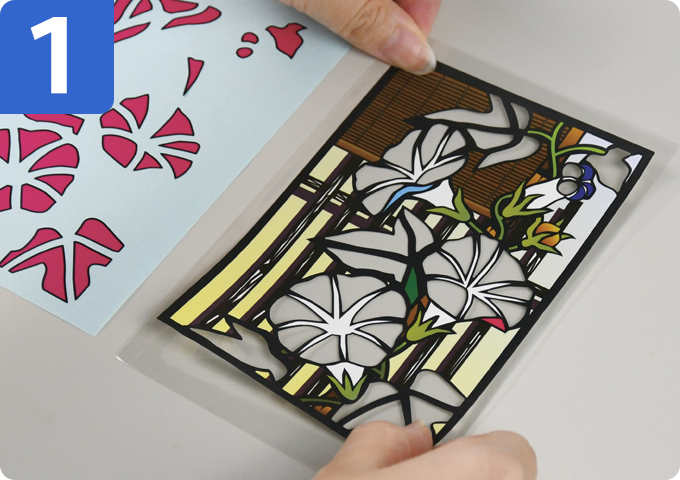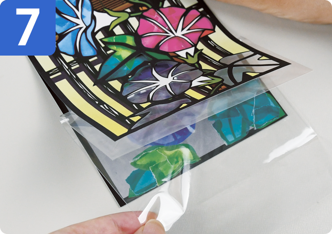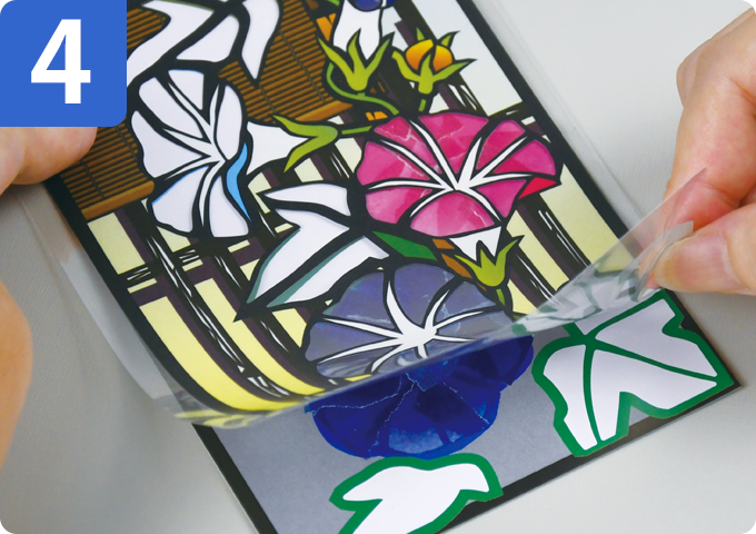 透明袋から少しずつはがしながら、下絵シートに貼り重ねます。