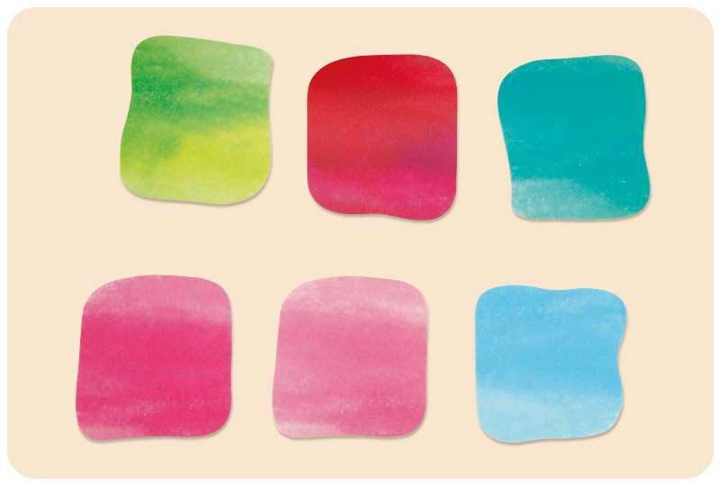 透明感のある水彩風のカラーシールで、濃淡を出したり重ねて色をつくることもできます。心明るくなるカラフルな仕上がりとなります。 -