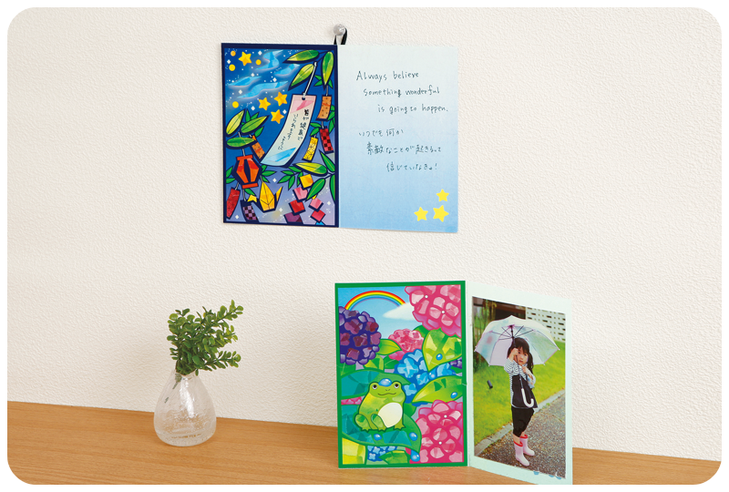 絵柄の裏面には、郵便はがき印刷がされています。完成したら、切手を貼って「絵葉書」として郵送できます。 -