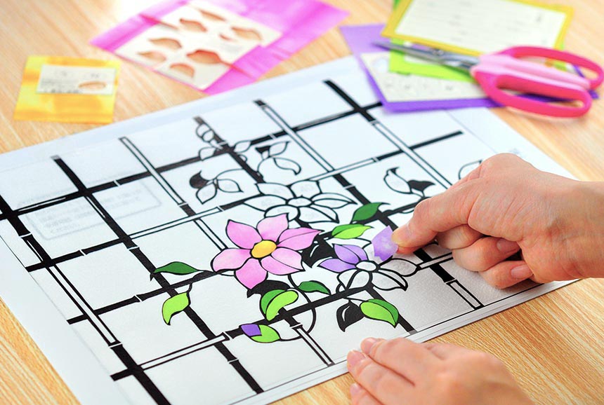 光を透過する特殊シートに和紙で絵を作る「貼り絵タイプ」と、日本の美しい紋様がキラキラ七色に光る「穴あけタイプ」の2種類があります。