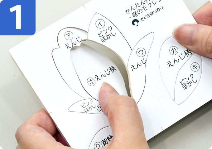 パーツを下絵に直接貼るのでモチーフへの組み立てが簡単。記号に合わせて貼ってパズルのように楽しむこともできます。 -