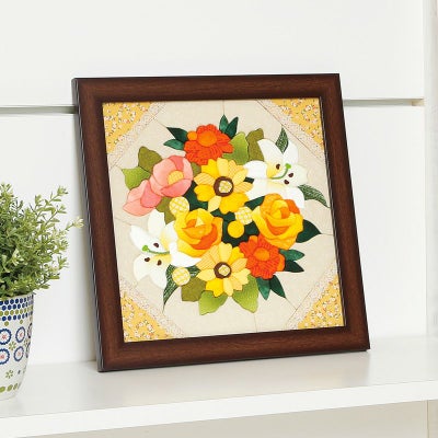初めて作ったきめこみ作品でした。時間はかかりましたが、難しくはなかったです。次の色が見たくて、どんどん手が進みました。鮮やかな黄色で、作っていても飾っても気分が明るくなるのが良いです。部屋に本物の花がパッと咲いたみたいです。本当に「ブーケ」の名にふさわしいきめこみで、大好きです。このシリーズはそれぞれ雰囲気が違うので、全部揃えてみたいです。